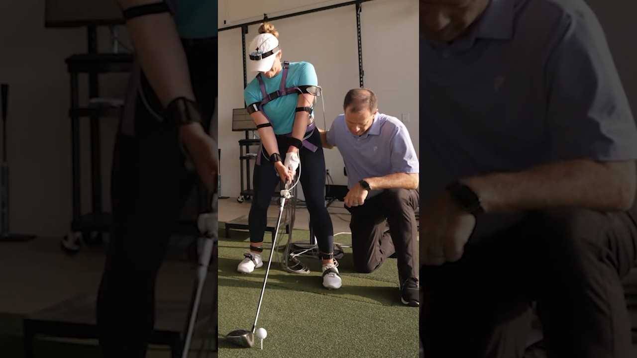 take a take a back swing take a back swing big lift one of the techniques we use a lot here at TPI is called R&T it’s called reactive neuromuscular training in other words I’m going to try and make you do something and you’re going to have to react to that and try and counterbalance it so if Gabby’s moving towards the golf ball in the back swing what I like to do is I’m going to try and throw her towards the golf ball in the back swing and she right away she’s going to go “Whoa whoa whoa if I don’t do something he’s going to win.” And you know good players don’t like to have somebody else win right so she’ll learn what it feels like to activate the muscles to move in the right direction so when I’m not there it’ll be easier that’s called R&T good okay now you you felt that like little resistance don’t let me throw you over in the back swing okay i’m ready i was good i’m telling you we get rid of that it’s going to get better yep there it is she gets to 0.9 so she moves forward almost an inch right if if she doesn’t think about it when the ball starts going left i mean look look where it is now it’s 2.6 you cut it over 50% i mean you went from you were moving towards the ball two and a half 2.6 in that last one was 0.9 okay in the back swing so you can lift do whatever you want you just can’t move closer to the golf ball right it’s always great to see when you put a drill in play and then the next swing out of the gate the player you can see the look on their face is like “Wow I got something there.”