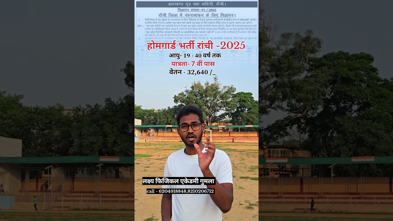 रांची जिला के साथियों के लिए बहुत बड़ी खुशखबरी है क्योंकि गृह रक्षा वाहिनी में 1614 पोस्ट की भर्ती निकली है और इसमें सिर्फ अगर आप रनिंग में एक्सीलेंट करते हैं, दौड़ में एक्सीडेंट करते हैं तो आपका नौकरी फिक्स है क्योंकि यहां पर एग्जाम नहीं होता है। सिर्फ और सिर्फ सुरती लेख होगा और आपका नौकरी लगेगा और वेतन लगभग ₹32,000 महीने आसपास है। तो इतनी बड़ी खुशखबरी है। आप लोग बसशर्ते मेहनत करना शुरू कर दीजिए और यदि आप खुद से मेहनत नहीं कर पाते हैं तो हमारे एकेडमी में आइए। हमारे पास 400 मीटर का प्रॉपर ग्राउंड है। आने वाला दिन में आप लोग के लिए बहुत स्पेशल आप लोग का तैयारी करवाएंगे और एक्सीलेंट मरवा कर छोड़ेंगे। जय हिंद, जय