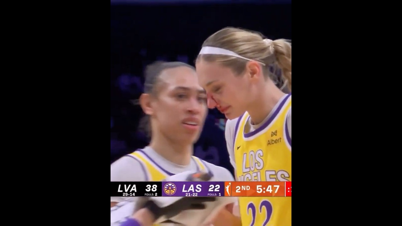 Los Angeles Sparks forward Cameron Brink gets a bloody nose from Las Vegas Aces forward NaLyssa Smith’s elbow. 9/11/2025