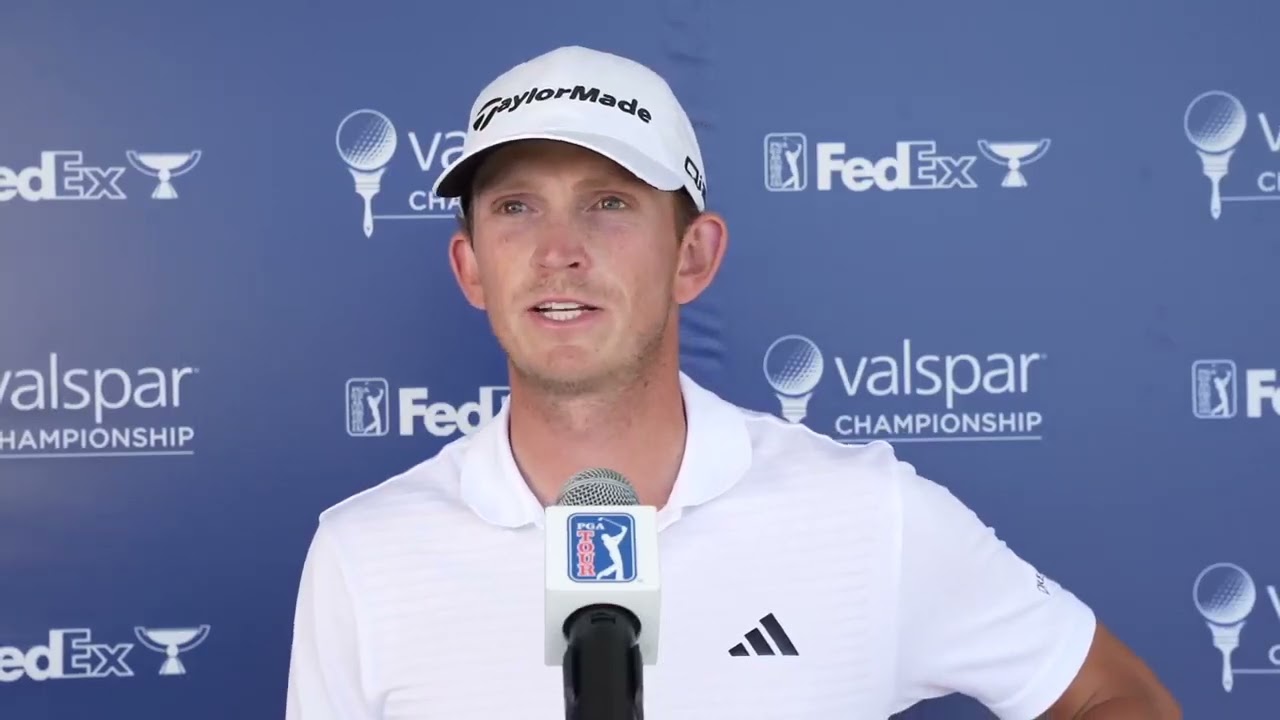 what up what’s up we’ll just start off with some comments about po under your opening round uh how’d it go out there today it was good not a not a great start um I B my first two and was hitting it kind of everywhere but I think it was just cold and early and I kind of settled in um and started playing pretty good rolled the putter really good um so I was happy with that but it’s it’s getting difficult we had a we had about a nine hole stretch of no win which was very nice but it’s it’s starting to ramp up so it’ll be tricky this afternoon do you feel like your wave was the fortuitous wave this week uh it’s looking like it obviously everything could change you know uh weather is just a guess but the forecast is looking like yeah definitely so this morning it was very calm so that was helpful um and now it’s not so and I think it’s supposed to get worse and do you um kind of your second year on tour do you feel feel in any ways more comfortable kind of just as you go through courses and preparation and are there any like little just I guess in teeing it up and just working yeah definitely so Ian I showed up Tuesday night I flew in late because I just wanted a couple days off after the players um so I was comfortable with this course I played last year I wasn’t really worried about it just played the proam on played nine holes so um yes definitely a lot more comfortable seeing the courses for the second time um it’s nice not having to learn a whole course in one day so like last year you wouldn’t have wanted to do that you would have felt compelled to get here right especially this place the back nine I didn’t play The Back N in practice here this week um and not seeing that before would be a little tricky with with some of those t- shots um but now that I know what I’m supposed to do you know it was I felt confident doing that uh take me through the eagle uh yeah number one uh I think wind was kind of down off the left which is a good win for us we can cover that left bunker um so I hadit a nice drive up the middle and I had a six iron to the probably 25 ft or so just pin High left and and knocked it in once you once you got things going what what part of your game was working best I was putting very well I was hitting at you know okay shots and some really good ones but um for the most part I was just making the puts that I was supposed to make and then I made a couple that I wasn’t supposed to make what did you do at home for those two days side on the couch uh I was kind of sick on the weekend and at the Players so I kind of needed a reset needed to go home and relax a little bit and kind of get my system back recharged but yeah I just sat hung out for two days and then flew down did you watch any like shows or anything or were you just like feding uh no I I watched the playoff on Monday for the the players watch JJ and Rory um other than that now I went and saw my parents that was about it packed up Tuesday took my time and then what’s your Clemson prediction how far do you have them going I have them going to the 16 and that’s kind of embarrassing to say I should have them picked further but you know I I just is what it is I hope they hope they win the whole thing though uh you touched on it a little bit but what is the competitive advantage of having played in the morning and not having to deal with the wind this afternoon yeah this course is very demanding off the te um the fairways get pretty tight and the wind it seems like out here whatever way it blows is always sideways so the ball’s kind of getting blown One Direction or the other and um having no win we can kind of choose where we’re going to hit it and and hit those shots and then the afternoon it’s more of a guess Jacob it’s a pretty strong set of high threes of this this venue um you bird three of the four of them yeah which one was the most outstanding of those boties and you definitely eight um eight wind was blown pretty good I hit a seven wood on the par three so anytime you’re hitting wood into a par three it’s pretty good hole um and then I that was one of the putts I shouldn’t have made it it’s probably 30 ft or so and knocked it in what you how’d you make the power on the one that you made power on I don’t remember I know I made two good birdie putts uh I guess that would have been 13 yeah I just hit it a little bit long left and hit a nice chip nice putt yeah thank you yeah thank you all good thanks guys
