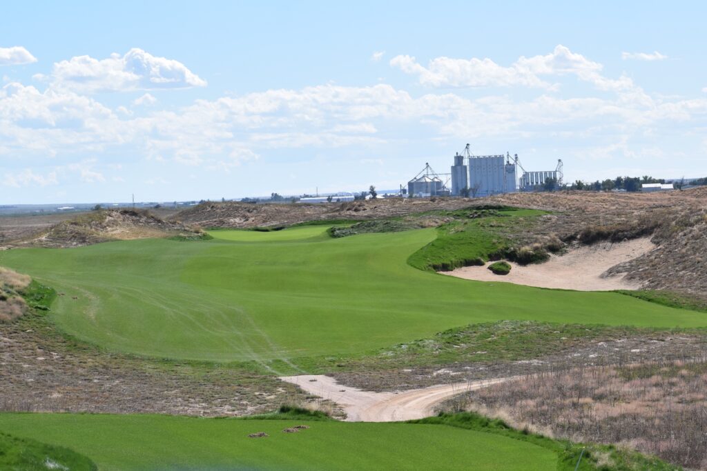 Rodeo Dunes is being constructed on a huge swath of prairie that has been operated as a ranch by the Cervi family since 1883. It’s wide open (very, very few trees), sandy — with some areas of the Coore/Crenshaw course constructed out of sand dunes — and there’s plenty of native brush. There are no significant water features on the course. The most prominent structure of note currently near Rodeo Dunes is the Roggen Farmers’ Elevator located just off of I-76.