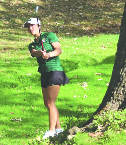 Northern Michigan University women’s golfer Abbie Pietila hits from near a tree during a collegiate meet held earlier this year. (Photo courtesy NMU)