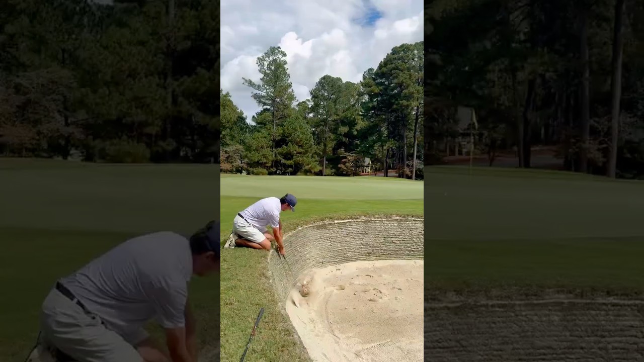 You have to hit the first one backwards, at an angle, along the sod wall. You're hoping it will bounce off the sod wall and come to rest with more room to get a stance; and then you can play it to the green as you should have a better chance of getting the ball over the lip of the bunker.