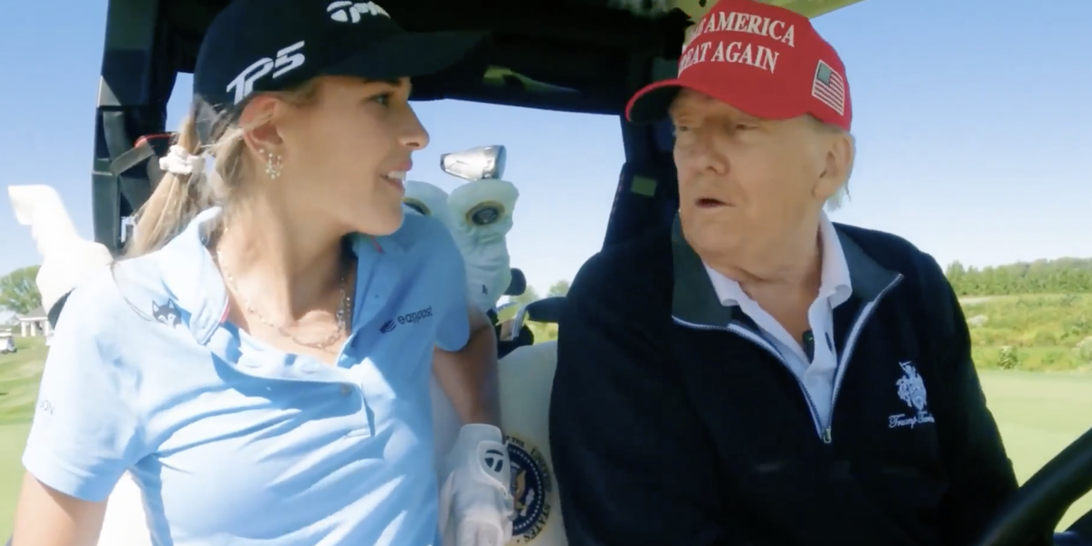 Dressed in full golf attire, with Trump wearing his trademark red MAGA cap, the pair chatted while cruising around the course.