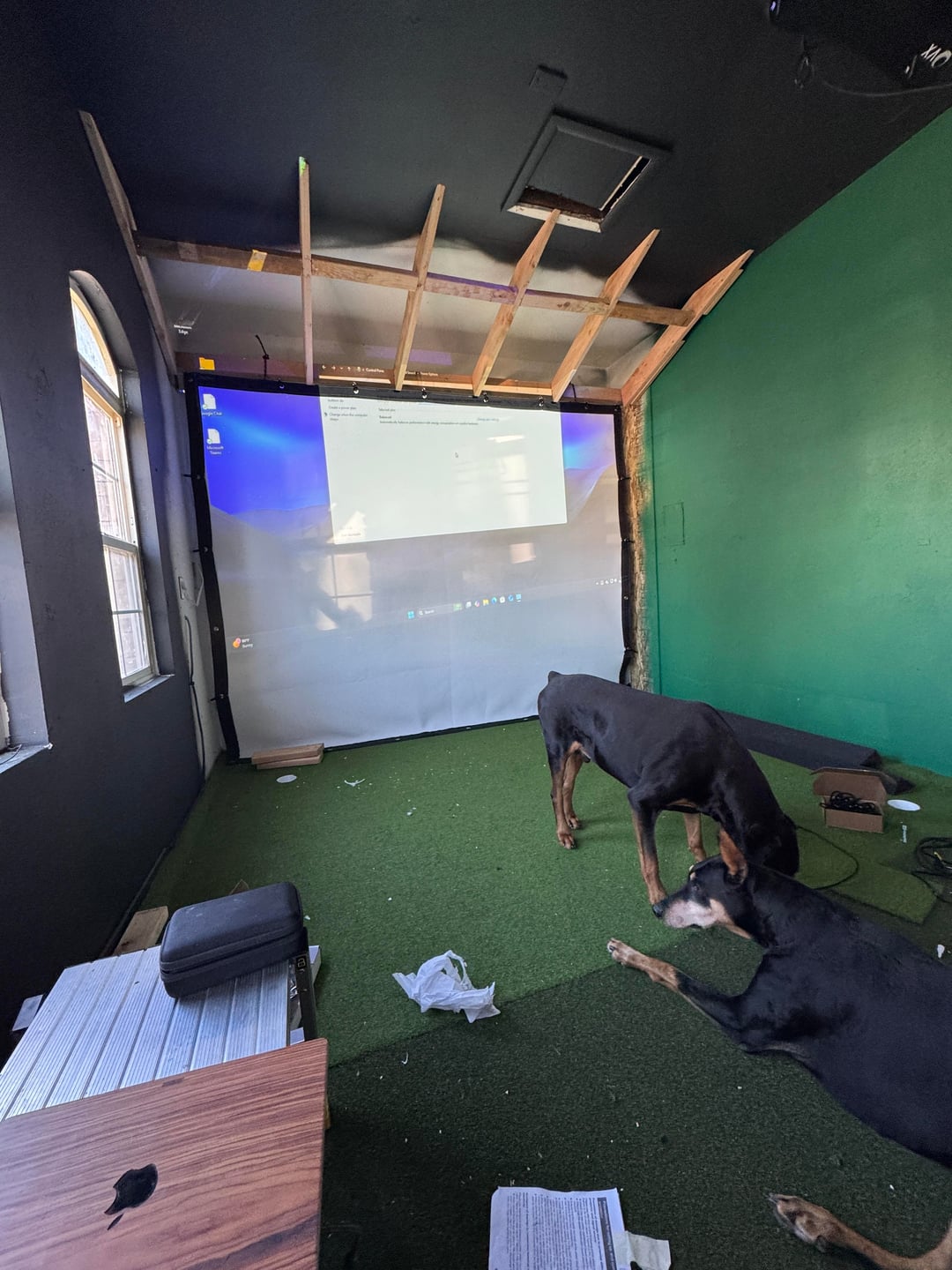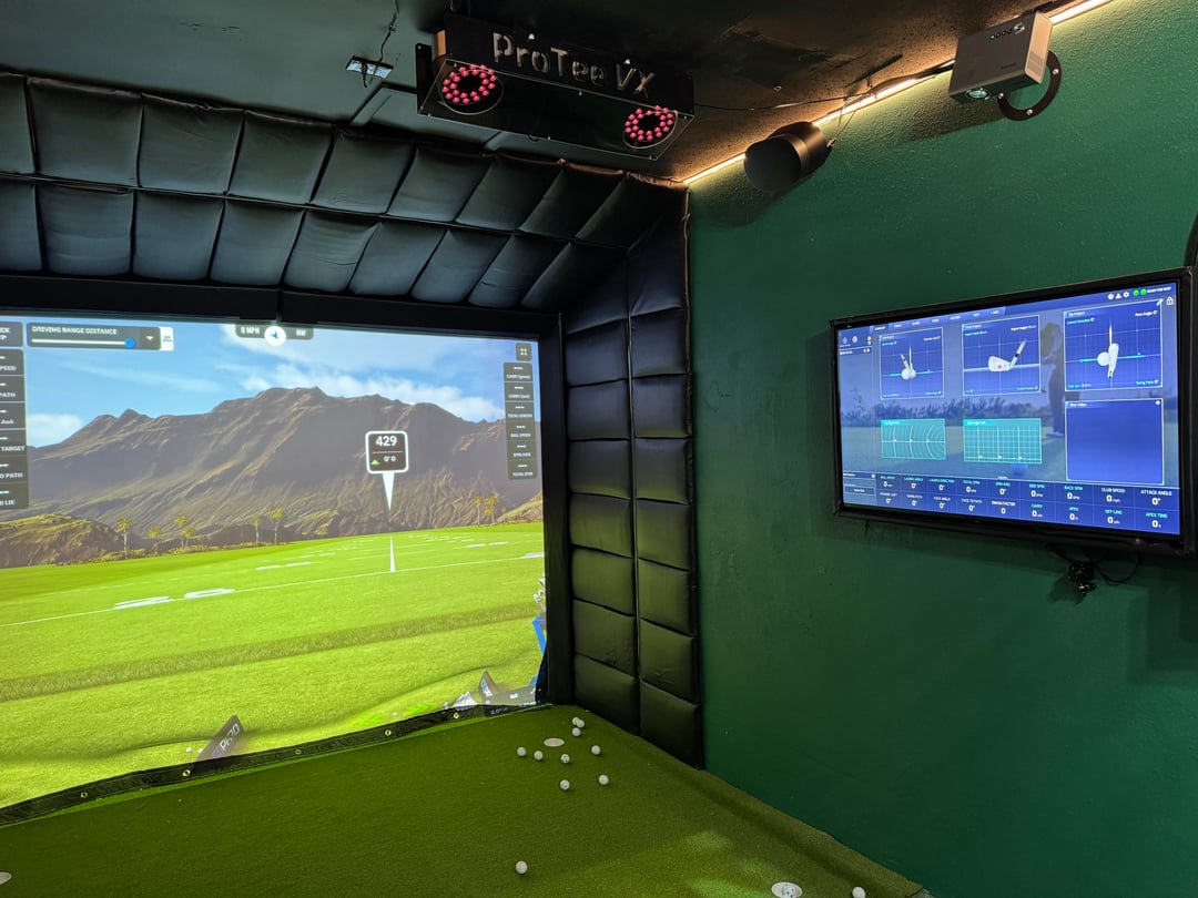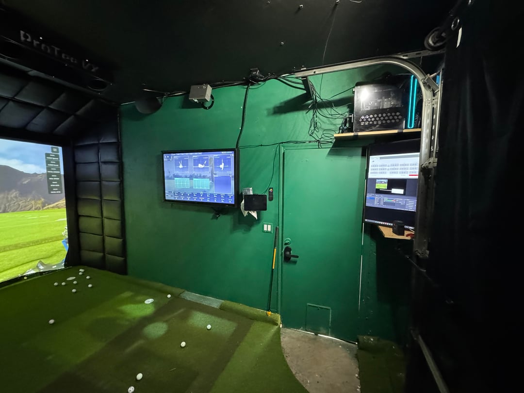 Protee VX, Sig Softy mat, DIY floor to match, DIY wall panels, Spectrum Poly screen, Panasonic projector main, rando Amazon projector for the floor, Alienware PC, Sonos speakers. 10.5' w, 17'd, 9.5' ceiling. No lefties allowed.