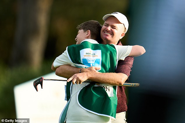 Heartwarming scenes erupted on the 18th green on Sunday as Morrison and his son and caddie Finley (left and right) celebrated the epic victory
