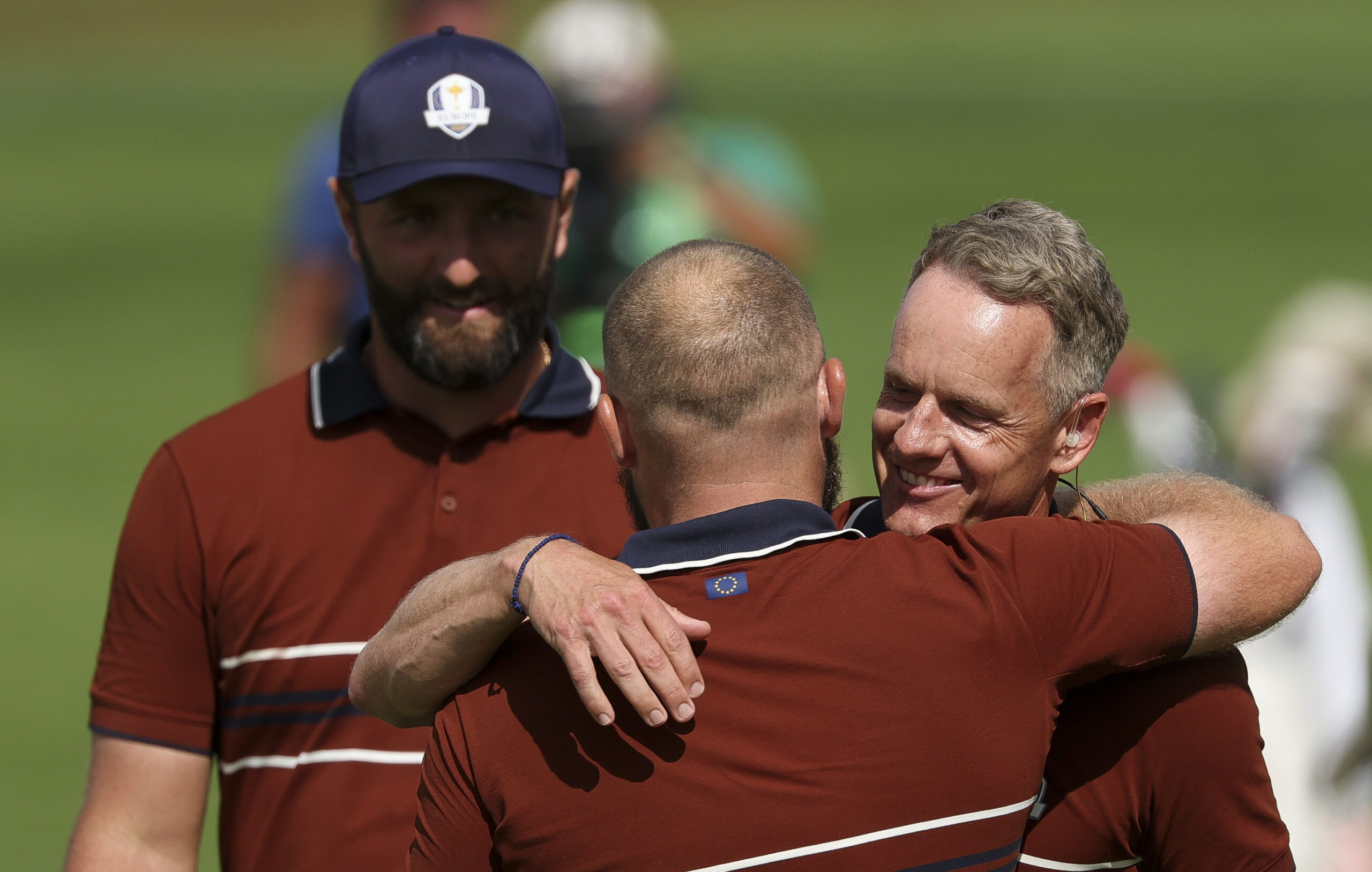 FARMINGDALE, NEW YORK – SEPTEMBER 27: Team Europe Captain Luke Donald reacts with Jon Rahm & Tyrrell Hatton of Europe after winning their match during the Saturday morning foursomes matches of the 2025 Ryder Cup at Black Course at Bethpage State Park Golf Course on September 27, 2025 in Farmingdale, New York. (Photo by David Cannon/Getty Images)