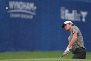 Aug 2, 2025; Greensboro, North Carolina, USA; Nick Dunlap chips onto the 18th green during the second round of the Wyndham Championship golf tournament. Mandatory Credit: Allison Lawhon-Imagn Images