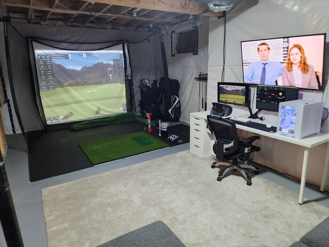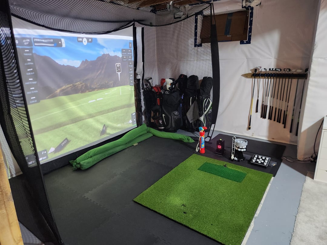 Asked our builder to increase the basement ceiling to 9ft before they dug ground last year. Moved into our new home back in March. First order of business was to set this up in time for winter golf in Canada. Planning to add a pin spot light and to raise the control box onto a stand for ease of use. The golf sets in the corner are friends and families leaving them here for the winter.