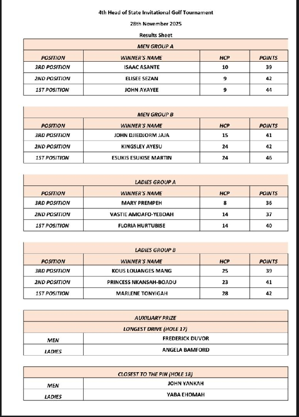 The 4th Head of State Invitational Golf Tournament produced thrilling results at the Achimota Golf Course on November 28, 2025.