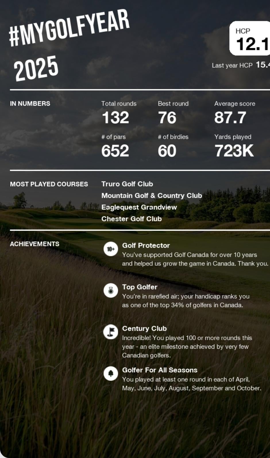 Another great golf season. Very happy with my improvement. Golf Canada App.by ImaFreemason Golf FunRelated Posts I’ve registered to take my PGA playing ability test at TPC Sawgrass December 11, 2025 First golf set (new to golf) December 10, 2025 clutch gene confirmed 🧬 December 10, 2025 Turned an old wedge new (sorta) again! December 10, 2025 I just finished the 72nd hole I have played with the same ball over the last week. Combined score was +41. December 10, 2025 What can you all tell me about this driver? December 10, 2025 7 Comments ItsMangel 17 hours ago Golfer for “all seasons.” Thanks, Canada. newCRYPTOlistings 17 hours ago If it’s going to show a birdie number. It’s only fair tot he rest of us to show the bogie number too chic_kennugget 17 hours ago 132 rounds?! What kind of job do you guys work that allows for this lol chenrung 16 hours ago What’s interesting to me is a 12.1 only get’s you in the top 34%.I have a friend who is a 12.6 here in Ireland and that’s good enough to be in the top 19% in the country. Iuvenesco 16 hours ago How the hell did you play 132 rounds?! That’s like 1 every 3 days. I did 27 rounds this year and I was happy with that! Golfshoeaddiction 16 hours ago Kudos to you on the index improvement! Lor_azepam 16 hours ago https://preview.redd.it/1v7xupatmd6g1.jpeg?width=1440&format=pjpg&auto=webp&s=39d4123e6c8499ae6fffe4a0abbc68dea541855eHello fellow ns golfer!Write A CommentYou must be logged in to post a comment.
