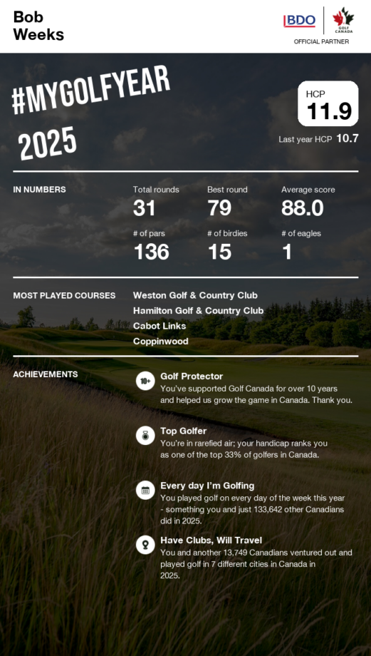 Golf Canada members can now relive their 2025 golf season with #MyGolfYear, the annual personalized recap of rounds played, milestones and achievements, presented by BDO.
