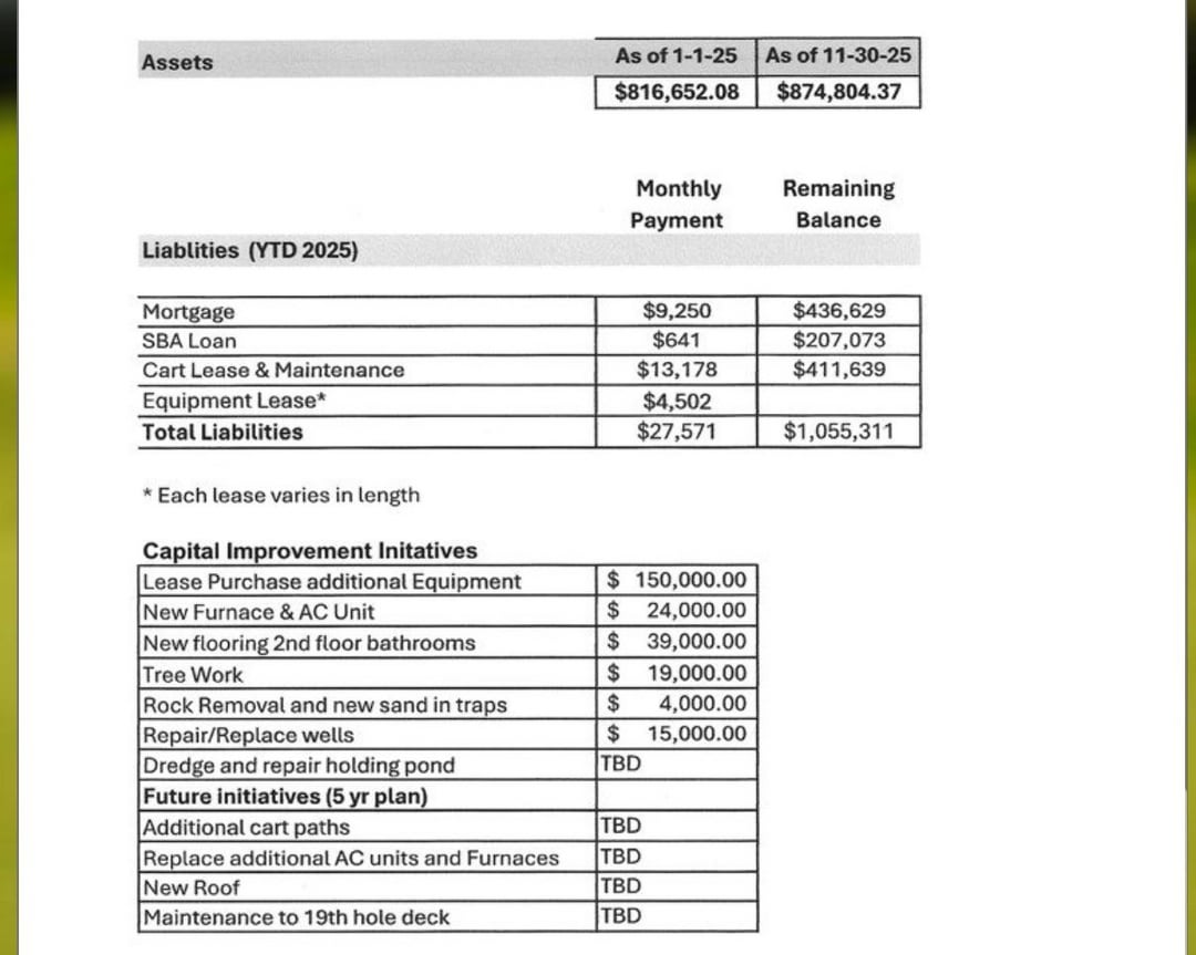 You have “improvements to 19th hole deck” in the future plans but no financial documents on how food and bev is performing? Is there no food and bev?