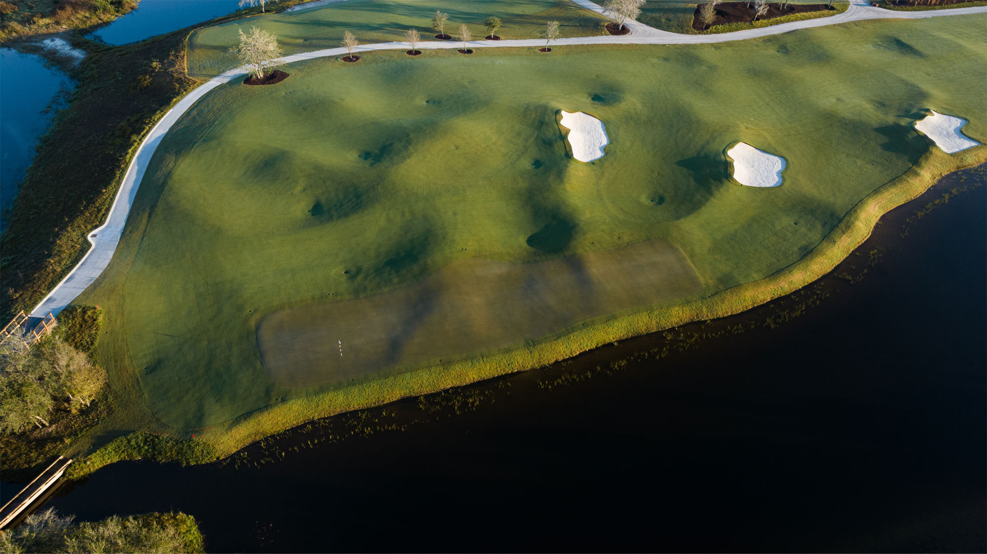 While the reliance on catch basins may go unnoticed to the average golfer, the theatrical bunkering will not. Interestingly, multiple bunker styles and sand types were implemented across the course. Larger waste bunkers have jagged edges, tan sand, and floating grass islands, while the more common bunker has artificial turf edges, white sand, and very steep faces. These varying styles simply clash too much, creating a chaotic and unnatural visual. Perhaps over time they will settle into the landscape and appear more symbiotic, but the overall approach is questionable. There’s so much going on with the golf holes themselves that the extra whipped cream on top isn’t doing the course many favors.