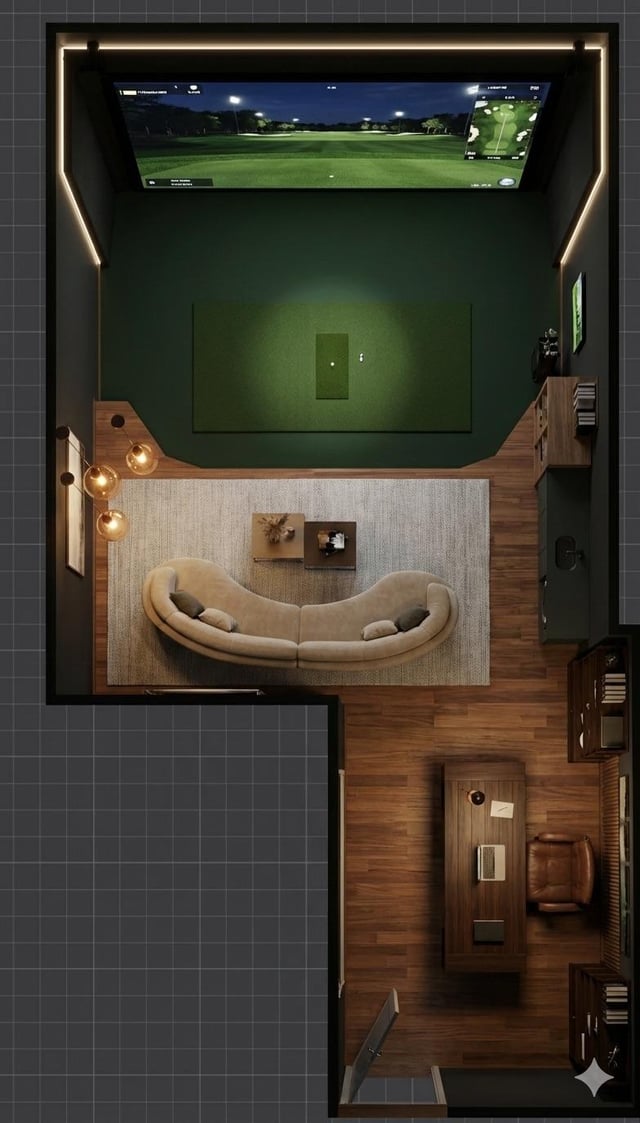 If you are going to have any kids around when the sim is in use, I would recommend rethinking the couch and considering some sort of physical barrier (like a bar with stools). Unless you have a ton more space than the rendering suggests, it appears too easy for kids (or adults who have been drinking) to forget there is someone in front of them swinging a golf club and step into harms way.