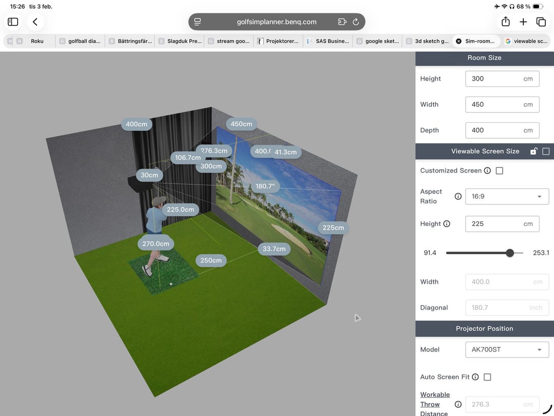 Hoping to get a screen that’s max 400×300, would like a screen that’s maybe 350×280, but I’m having issues using the golf sim planner on benq website.
