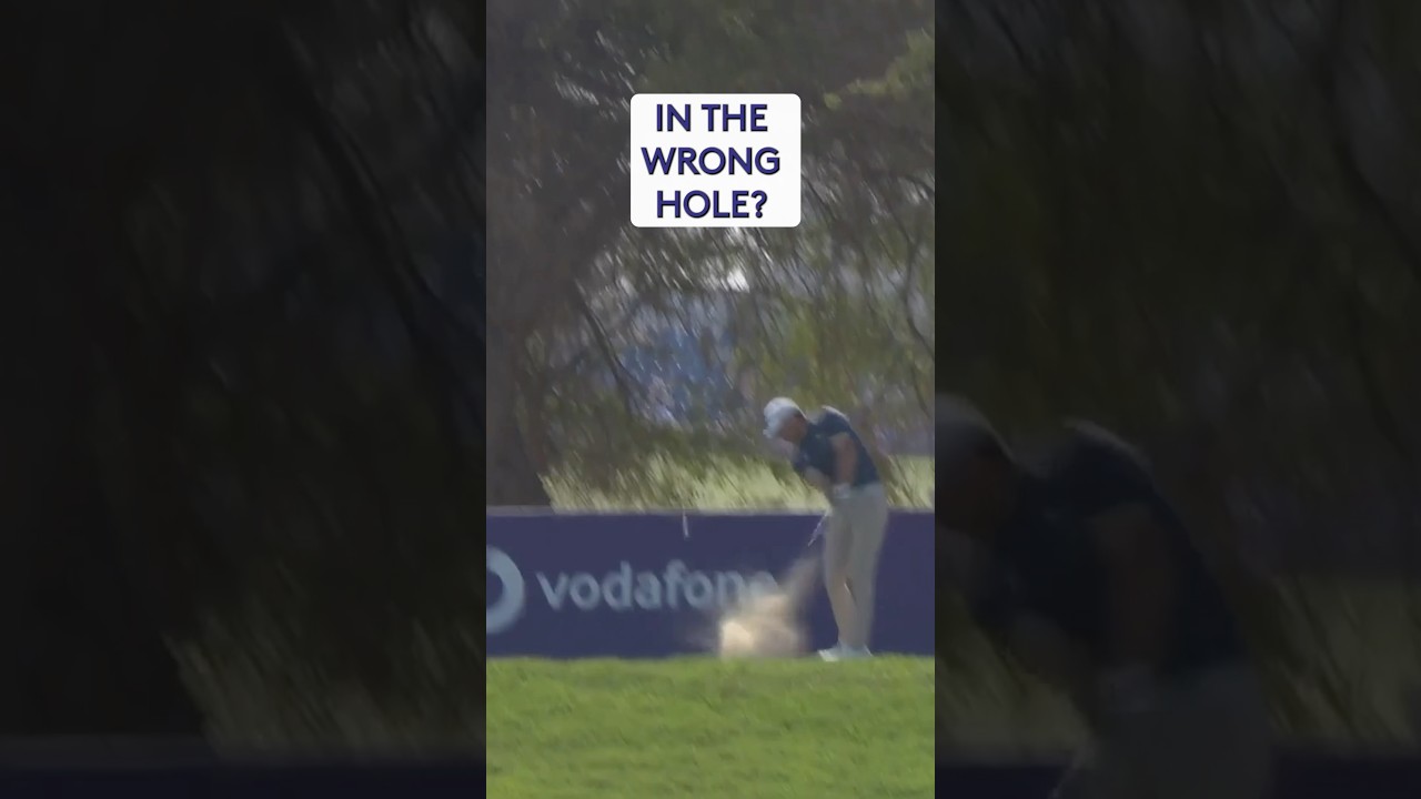 Mikael Lindberg’s tee shot ends up in the wrong hole much to the confusion of the commentators.