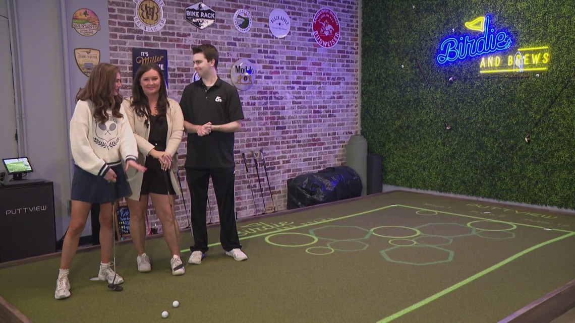 Birdie and Brews’ golf simulators allow guests to play virtual courses, along with a putting green for casual play.