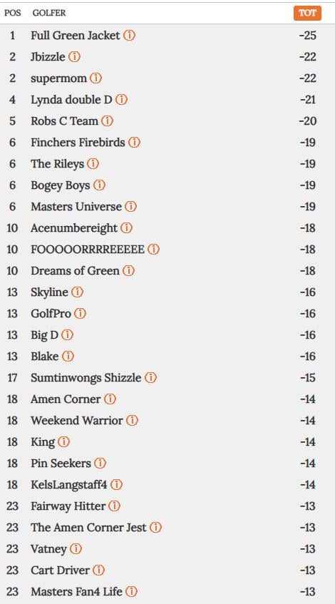In The Golf Tips Masters Pool, there’s been significant movement atop the leaderboard following Friday’s action. After Round 2, our current leader is Full Green Jacket, who has positioned themselves strongly with a 3 stroke lead heading into the weekend. With plenty of golf still to be played, we’re looking forward to an exciting finish as competitors chase down the top spot and we prepare to crown our first-ever champion.
