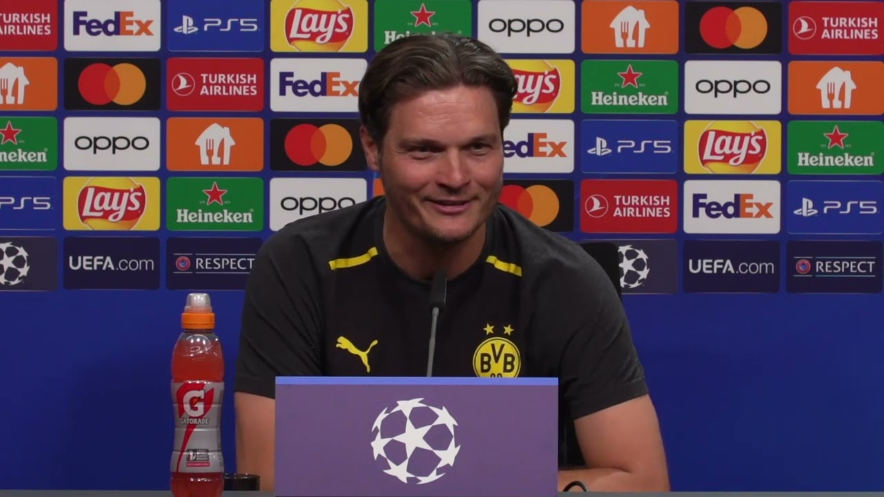 herzlich willkommen zu unserer Pressekonferenz am UEFA Media day vor dem Champions League Finale in London am Samstag für uns gegen Real Madrid ich begrüße hier auf dem Podium neben mir unseren Cheftrainer Ed tersit und genauso begrüße ich alle anwesenden Journalisten hier bei uns am Trainingsgelände in Dortmund freue mich sehr dass ihr alle hier seid von meiner Seite aus gibt’s noch paar kurze Infos zum Ablauf und dann können wir auch loslegen wir werden die Pressekonferenz auf Deutsch und Englisch durchführen also deutsche Fragen beantworte auf Deutsch die englischen auf Englisch unser dolmetcher Daniel Basan wird dafür sorgen dass jeder von euch auch das versteht worüber wir hier sprechen und ansonsten eine Info noch an die Leute die nicht so oft bei uns sind wenn es Fragen gibt einmal kurz auf den Knopf drücken am Mikro und dann seid ihr freigeschaltet wenn ich euch nicht nennen kann dann freuen wir uns einmal kurz über Name und das Medium vielen Dank und eure Fragen bitte der Krampe für die rohachrichten ja ich glaube der Trubel am heutigen Tag der ist ein untrückliches Zeichen dafür dass es jetzt wirklich langsam ernst wird kannst du mal beschreiben wieso deine Gemütslage gerade ist wie groß ist die Vorfreude oder auch die Anspannung die jetzt natürlich wahrscheinlich auch steigen wird ja lo zusammen ja klar bemerke ich auch dass dieser Raum noch nie so voll war wie heute und deshalb erstmal Verzeihung ein bisschen spät dran weil wir gerade noch sehr viele andere ähm ja Medienvertreter glücklich machen wollten und natürlich merken wir das wir haben aber auch da schon sehr häufig gesagt das ist doch genau das was wir haben wollen in der letzten Woche der Saison dass es noch um etwas so großartiges geht und dass es so viele Leute interessiert und dass wir was Großes erreichen können und deshalb respektieren wir das ganze was da jetzt so als zeidhow auf uns wartet aber unser klarer Fokus liegt weiterhin auf dem Spiel was am Samstag auf uns wartet und deshalb das ist das allerwichtigste und da sind wir gerade sehr gut unterwegs diejenigen die heute das Training vielleicht mitverfolgt haben haben gesehen dass wir eine richtig gute Energie in der Gruppe haben und großen Glauben haben dass wir da großartiges erreichen können und das ist der klare Auftrag dass egal was jetzt von außen auf uns zukommt dass das was uns so stark macht gemacht hat besonders in der Champions League das ist das was wir beeinflussen können und das wollen wir am Samstag so zeigen dass das dass es dann sehr erfolgreich wird Patrick Berger für Sky vielen Dank s hallo in wir hatten heute morgen die Möglichkeit mit Lars Ricken zu sprechen der in höchsten Tönen gelobt hat auch das Trainerteam und vor allen Dingen sie hat gesagt dass es ja stark ist dass die Mannschaft jetzt gerade zu so einem Zeitpunkt hinten raus noch mal richtig fit ist auf dem Punkt wie habt ihr das geschafft dass die Mannschaft in so einer guten Verfassung ist trotz der anstrengenden letzten Wochen und kann das vielleicht ein Vorteil sein auch Real Madrid gegenüber die jetzt noch spielen mussen und ihr ein bisschen mehr die frische vielleicht habt ja das ist auch vielleicht eine kleine Konstante in meinem Leben als Trainer dass ich jetzt die dritte Rückrunde erlebe als Chef Trainer und zum dritten Mal gefühlt der komplette Kader am Ende verfügbar ist damals vorm dfbpkalfinale in in in Berlin dann letztes Jahr gegen Mainz und halt auch jetzt diese Woche bevor es dann nach London geht da habe ich richtig richtig gute Leute um mich herum sowohl in meinem direkten Trainerteam mit meinen c-rainern zusammen aber halt auch in der Athletik in der medizinischen Abteilung deshalb kommunizieren wir häufig nicht so viel wenn es um Details geht wann jemand zur kehrt oder wie auch immer weil wir ganz genau wissen wenn es wenn es dann zum Ende der Saison geht wenn wenn Entscheidung getroffen werden müssen wenn wir irgendwann mal volles Risiko gehen müssen dann müssen alle da sein und das ist uns jetzt gut gelungen aber nochmals ich ich weiß gar nicht ist er da Jesco Jesco ist glaube ich nicht da der das letzte mal hat da sowas ähnliches angesprochen schwups am nächsten Tag haben zwei Spieler das Training abbrechen müssen deshalb wir warten jetzt erstmal den Samstag ab und hoffentlich können wir dann am Sonntag sagen alle waren da alle waren verfügbar und alle konnten leisten ihren Beitrag dazu leisten dass wir dann das Finale auch gewinnen und trotzdem wenn man jetzt aufs Personal eingeht D das es werden uns definitiv drei Spieler halt nicht zur Verfügung stehen durch durch durch Verletzung mit Rami benensamini Julian duranv und Matteo m aber der Rest der Mannschaft ist Gott sei Dank gesund und voller Lust Oliver Müller für die Welt hallo inwiefern unterscheidet sich diese die Vorbereitung auf dieses Finale jetzt von einer Vorbereitung auf ein in anführungstrichen normales Bundesligaspiel auch was diese 14 Tage Zeit dorthin angeht und vor allen Dingen inwiefern unterscheidet sie sich jetzt vom sagen wir mal der psychologischen Vorbereitung ja grundsätzlich ähm glaube ich hatte ich noch nie eine PK fün Tage vorne im Spiel und noch nie zwei pkss vor einem Spiel da merkt man schon dass es natürlich ein paar Sachen gibt die sich ein bisschen verändern aber dieser Rhythmus an sich also das das sportliche das verändert sich eigentlich für uns sehr sehr wenig weil wir jetzt genau eine Woche dazwischen haben wo wir kein kein Pflichtspiel hatten das ist ähnlich wie wenn wir im März eine Länderspielpause haben und dann am Samstag nach München fliegen um dann Auswärtsspiel zu haben also es waren jetzt nicht drei oder vier Wochen die wir überbrücken mussten sondern es war genau ein Wochenende und wir haben dann direkt nach dem nach dem Einzug ins Finale also nach dem Halbfinal Spielen gegen Paris uns uns in die in die Planung und in die Organisation für diese Zeit haben uns sehr viele Gedanken gemacht und 