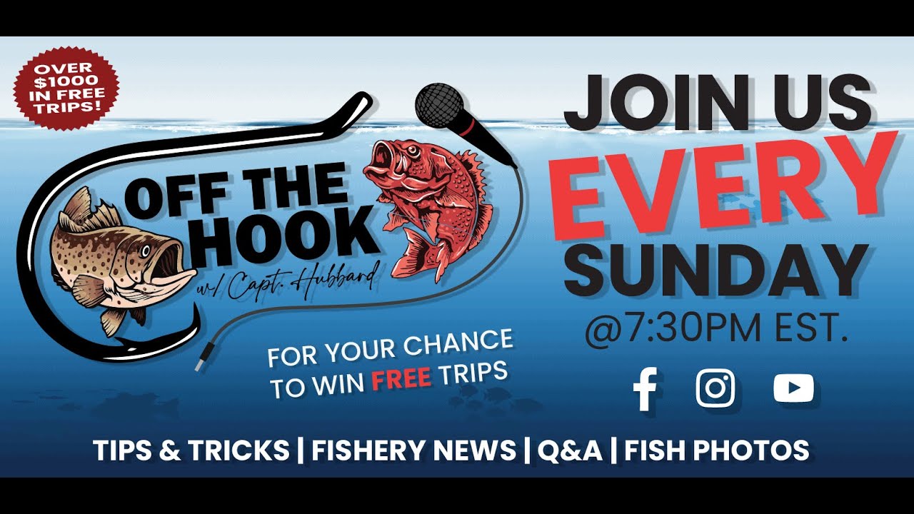Welcome to Off the Hook with Capt. Hubbard, where every Sunday night at 7:30pm, you’re in for an hour of fishing excitement! Share this podcast with your friends, drop a comment to let us know where you’re tuning in from, and hit that like button if you’re loving the show! And here’s the best part: stick around till the end because you have a chance to WIN FREE FISHING TRIPS!