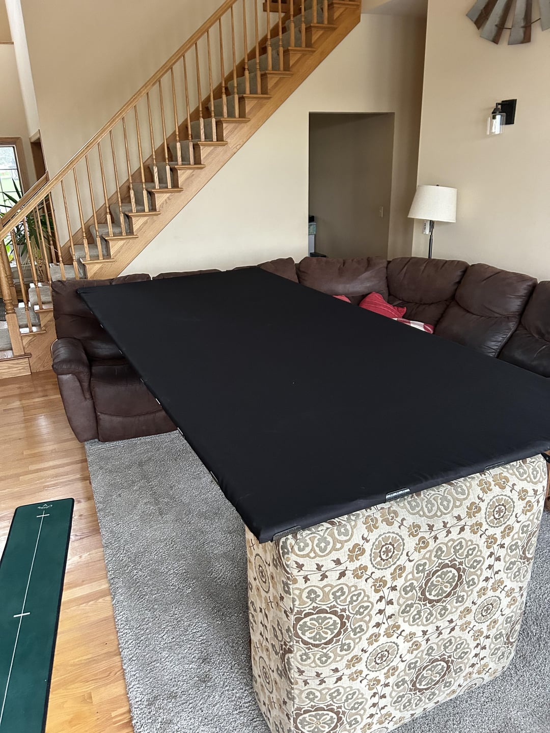 Still waiting on the flooring but it’s at least ready to share. Also adding some gutter foam for padding for when my kids play for piece of mind. The screen is so big I don’t need it but my son and a buddy already hit off the bottom bar. So I just lay down the Gutter foam on the ground now. Have my mother in law adding sleeves with the duck cloth then I will add magnets to it to pop them on and off for the kids. Plan to have the top and bottom though covered permanently