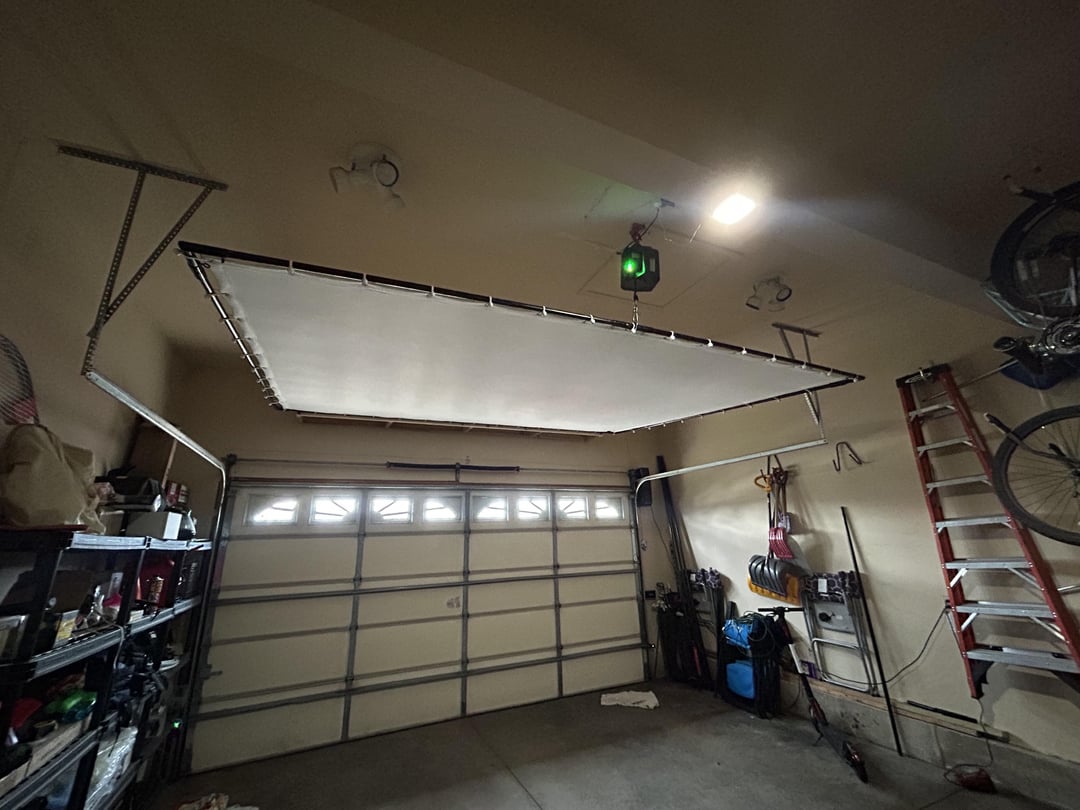 Just wanted to share the new budget build. Full disclosure I’m not totally done but it’s close. Long story short I have a 2 car garage and no other options. I decided to build a sim on a pivot so I can pull it to the ceiling when not in use. It was a much bigger pain than it seems but I tend to mess everything I do up 3x before I get it right. I think I finally got it right. Screen is 13×9.8 foot Durables brand from Amazon and it’s awesome.